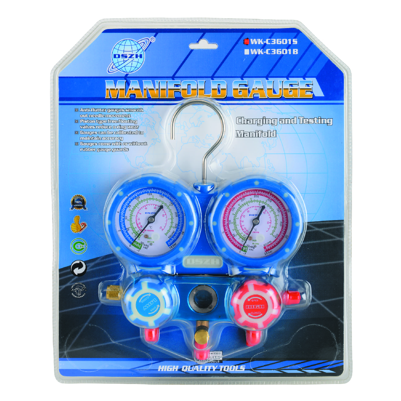 "Манометрический коллектор DSZH WK-C3601S это инструмент для определения давления в холодильном контуре. Манометры бывают аналоговые-стрелочный и цифровой. В компании РМТ можно выбрать манометры для любого назначения. Манометры помогают сервис инженеру определить: вакуум, температуру кипения фреона, давления разных фреонах а так же опрессовку азотом. Манометры бывают двух и одновентильные, вентиль перекрывает направление фреона, смотровое стекло показывает состояние фреона. В комплекте идут шланги Желтый-сервисный(к баллону фреона, азота, вакуумника). Красный-высокое давление , Синий-низкое давление. Новая серия манометрических коллекторов DSZH серии WK отличается высокой надежностью, качеством используемых материалов. Корпус манометров выполнен из алюминиевого сплава и покрыт резиной для защиты от повреждений. Металлические вставки в вентилях позволяет увеличить срок их службы./Манометрический коллектор WK-P3601S предназначен для работы с фреонами R22, R134A, R410A, R407C