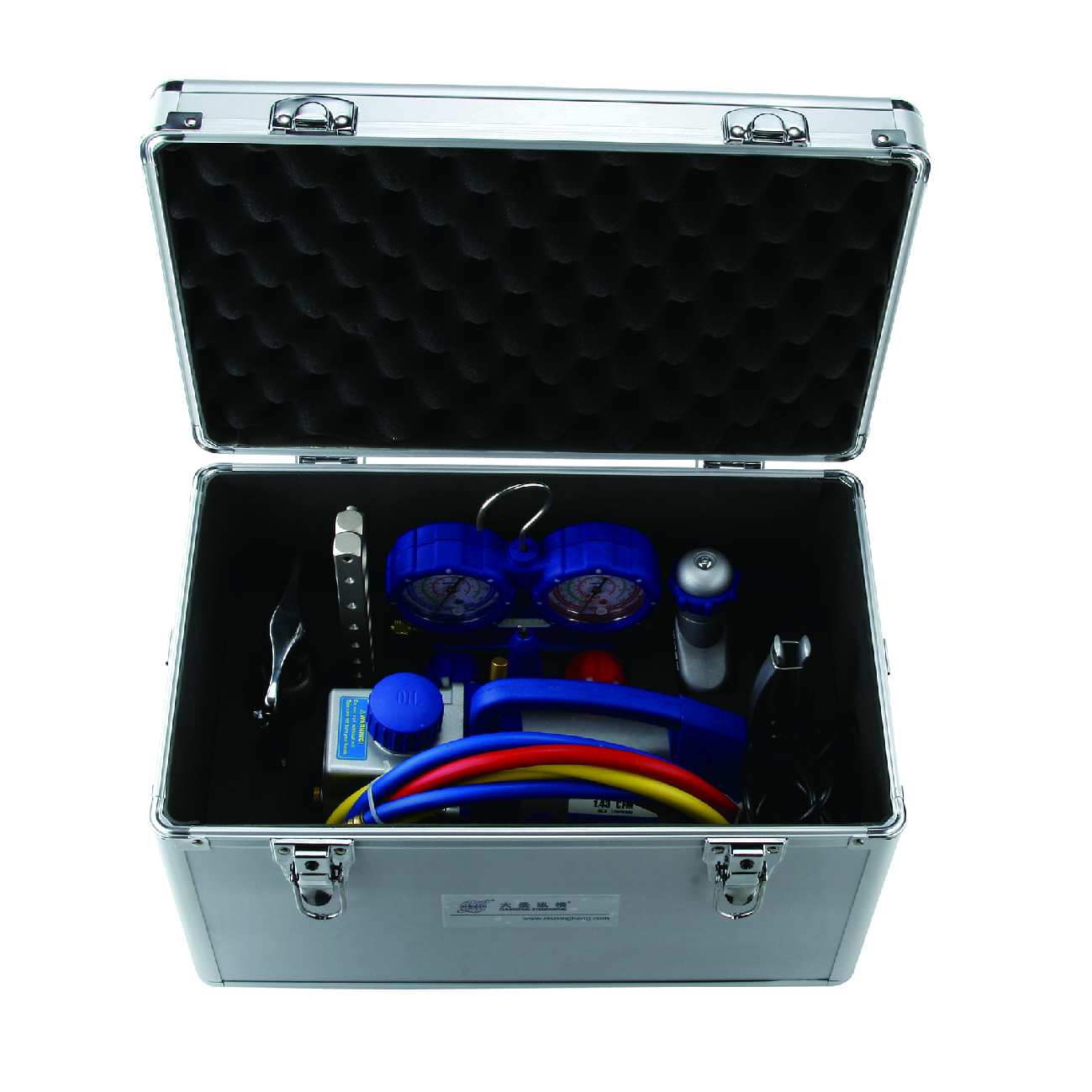 Шланги заправочные длина 150 см (3 шт). 1 шланг (1/4 SAE x 1/4 SAE) 2 шланга (1/4 SAE x 5/16 SAE), Труборасширитель эспандерного типа VK-622, Труборез VK-532, Риммер карандашного типа  VK-809 с запасными режущими ножами (2шт), Аллюминиевый кейс для транспортировки, Ремень для кейса, 2 ключа для кейса в комплекте."